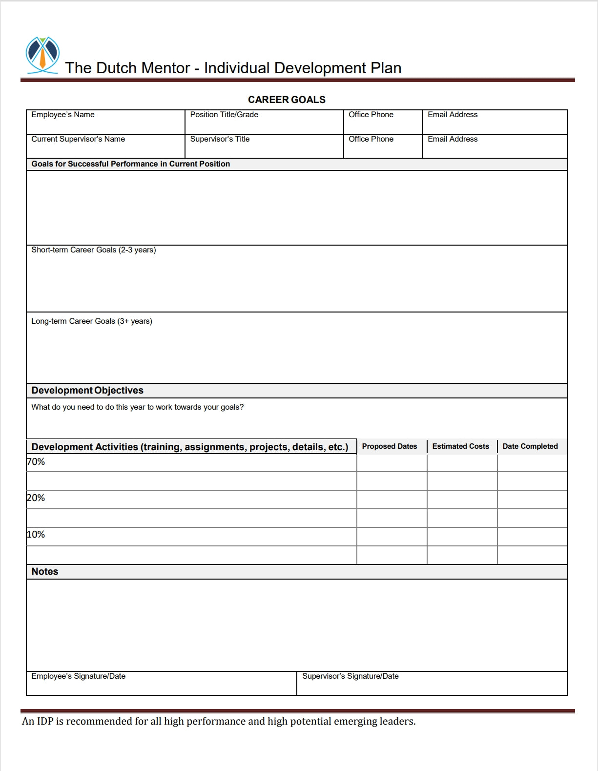 The *Dutch Mentor Individual Development Plan (IDP) Tool* is designed to help leaders map out their personal and professional growth. This customizable tool guides you in setting clear goals, identifying strengths and areas for improvement, and creating actionable steps to achieve success. Whether you're aiming to advance your career or enhance your leadership skills, the IDP Tool provides a structured approach to realizing your full potential and driving impactful results.