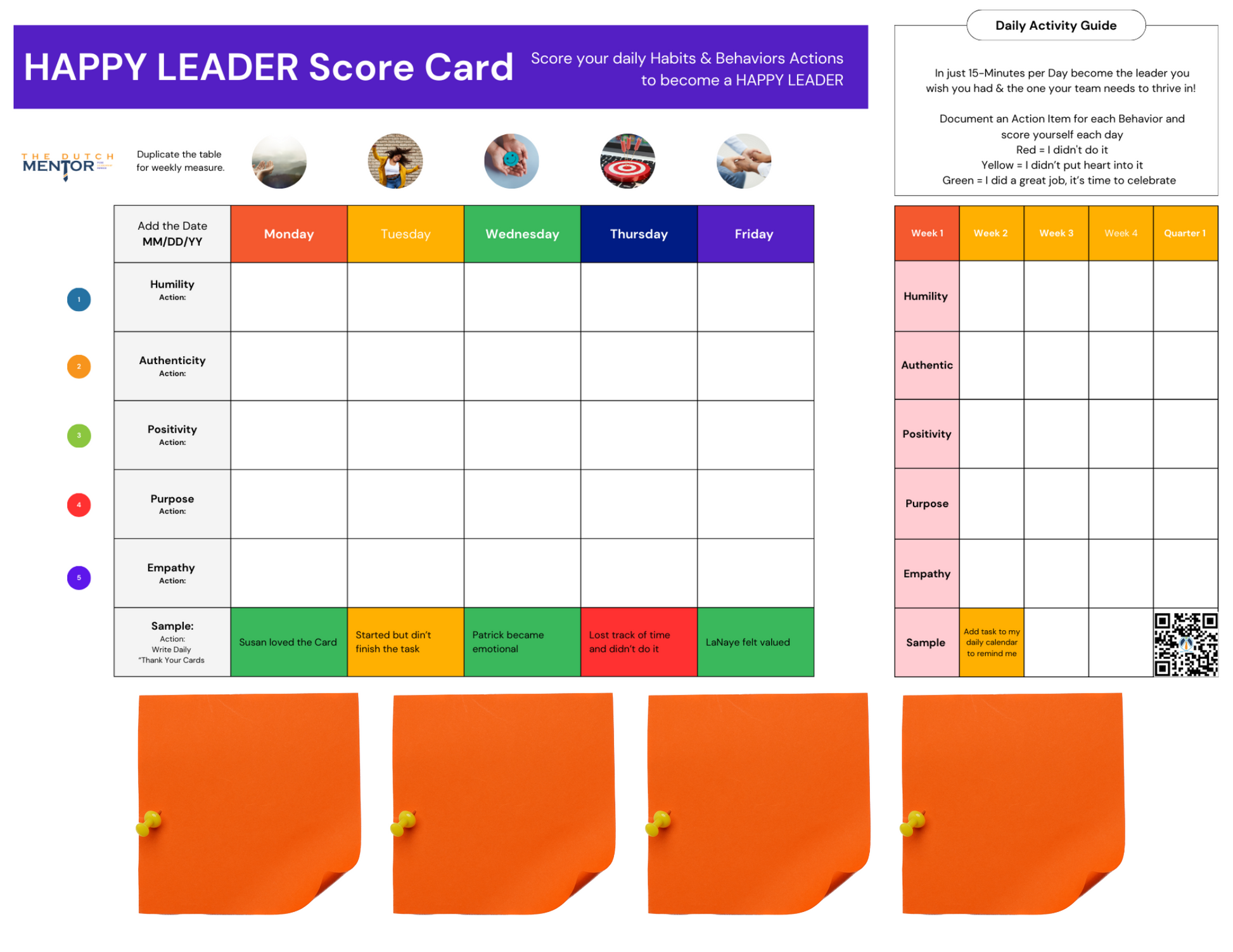 The *Happy Leadership Scorecard* is a practical tool designed to help leaders assess and improve their leadership style by focusing on key attributes like empathy, positivity, and purpose. Use this scorecard to track your progress, identify areas for growth, and create a more engaged and motivated team. Whether you're an aspiring leader or an experienced executive, this tool will guide you in developing a leadership approach that fosters happiness, productivity, and success.
